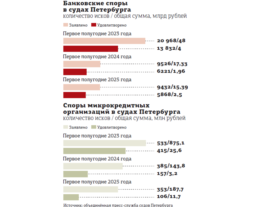 Как показывает статистика, пик исков от банков (как по количеству, так и по суммам) за последние несколько лет пришёлся на 2023 год. Тогда за январь-июнь кредитные учреждения предъявили горожанам почти 21 тыс. исков на общую сумму 48 млрд рублей. Впрочем, суды Северной столицы признали обоснованными только 13,8 тыс. заявлений, а общую сумму взысканий снизили в 12 раз — до 4 млрд рублей.